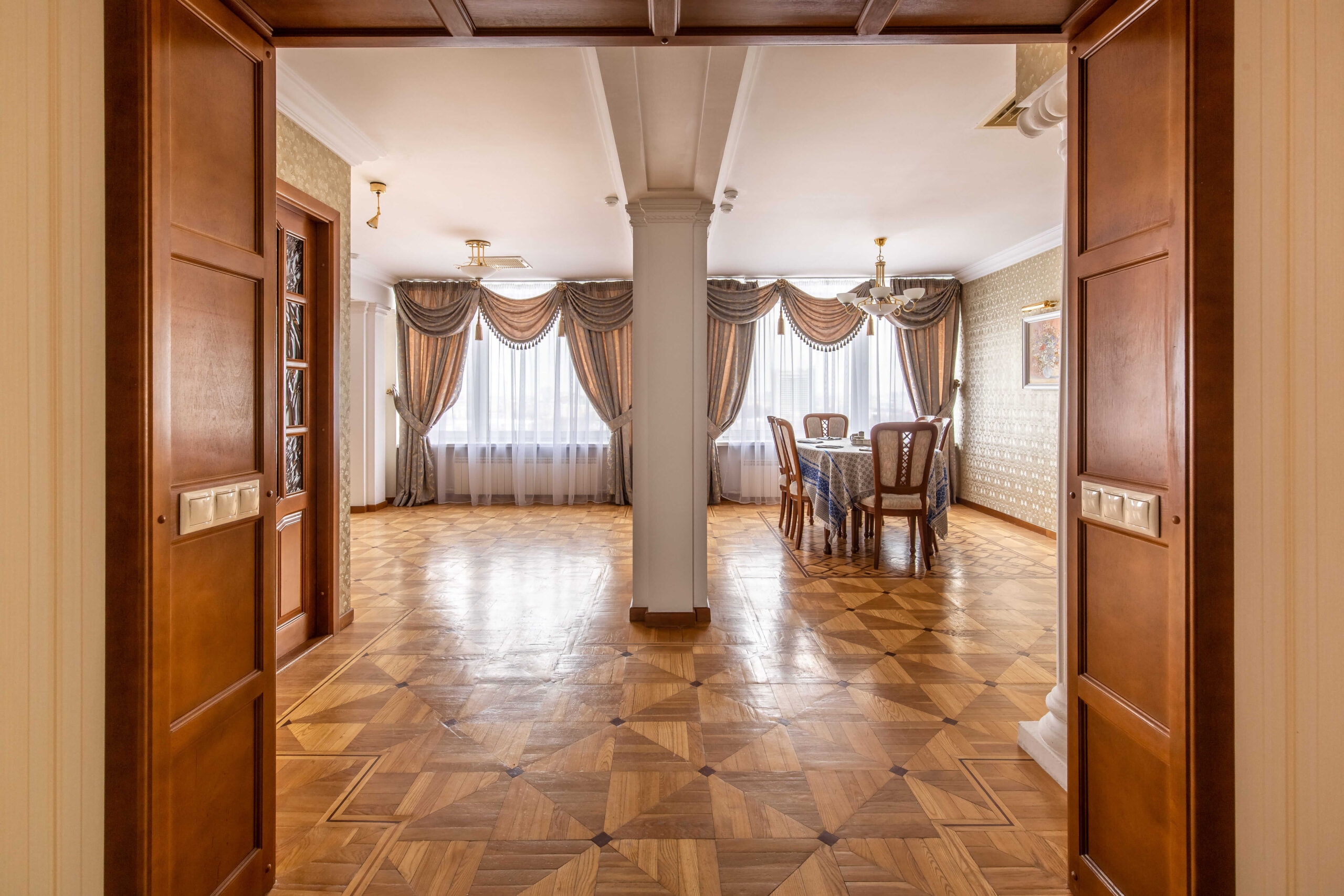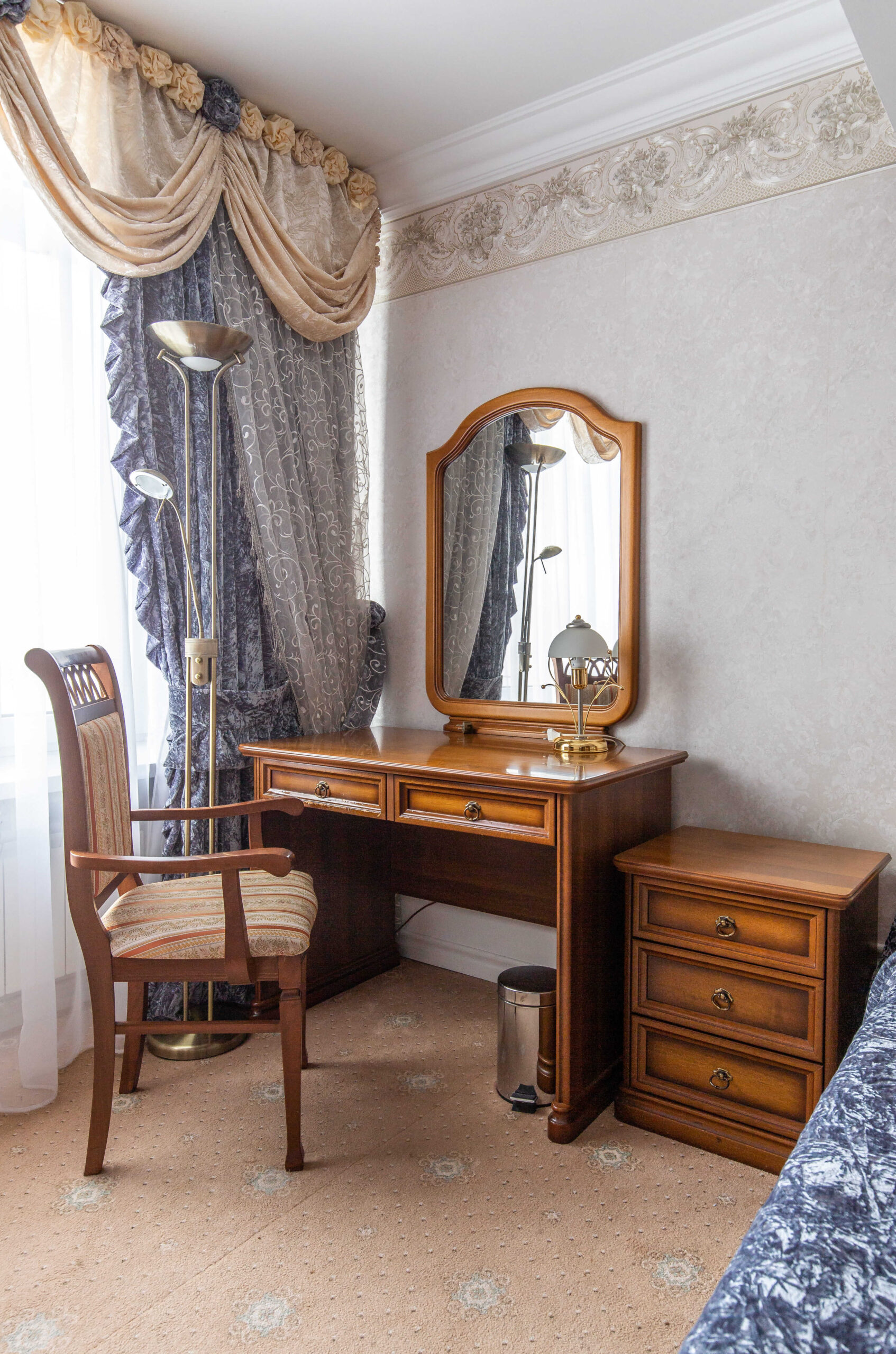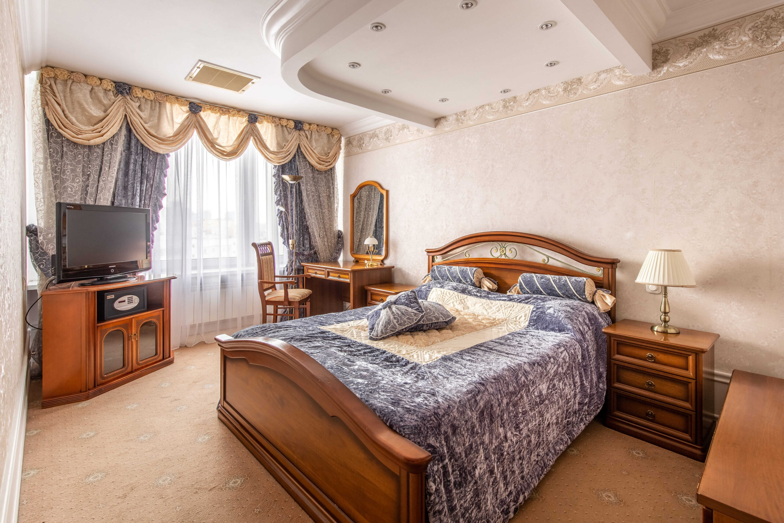 Номер VIP – самый просторный номер отеля площадью 135 кв. м. Выполнен в классическом стиле. Подходит для комфортного отдыха и деловых встреч. Состоит из 5 комнат: просторной гостиной с обеденной зоной, кабинета, зон отдыха, спальни, кухни. Из окон открывается вид на стелу «Минск-город герой», а также Парк Победы и Музей Великой Отечественной войны. Номера с авторской дизайнерской мебелью включают: кровать King size размером 180*200, 2 телевизора, рабочий стол, обеденная группа, сейф с электронным замком, 2 кондиционера, мини-бар (пустой), холодильник, буфет с посудой, просторная ванная комната с угловой ванной, биде, джакузи, гостевой санузел, косметические средства, фен, халаты, тапочки.