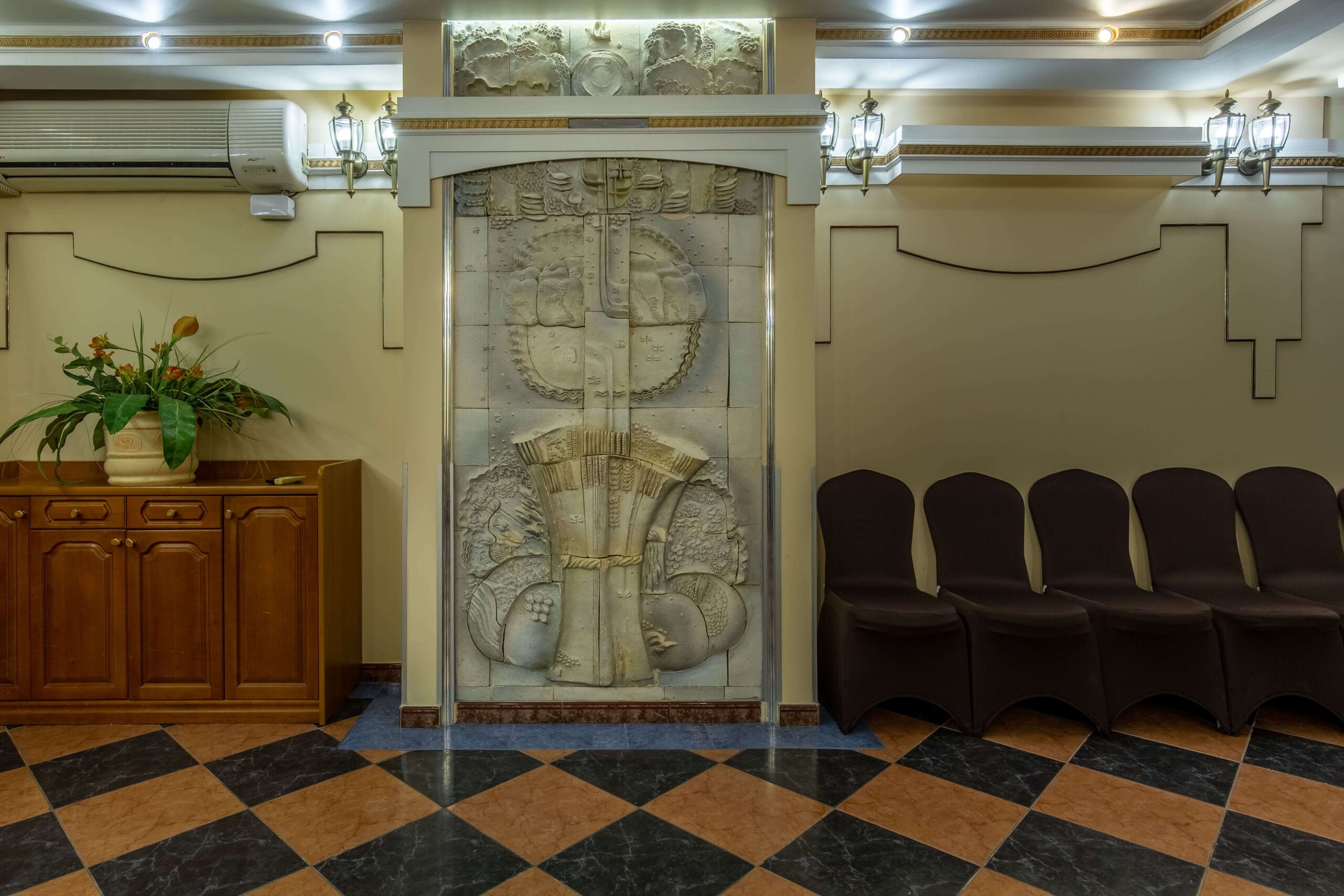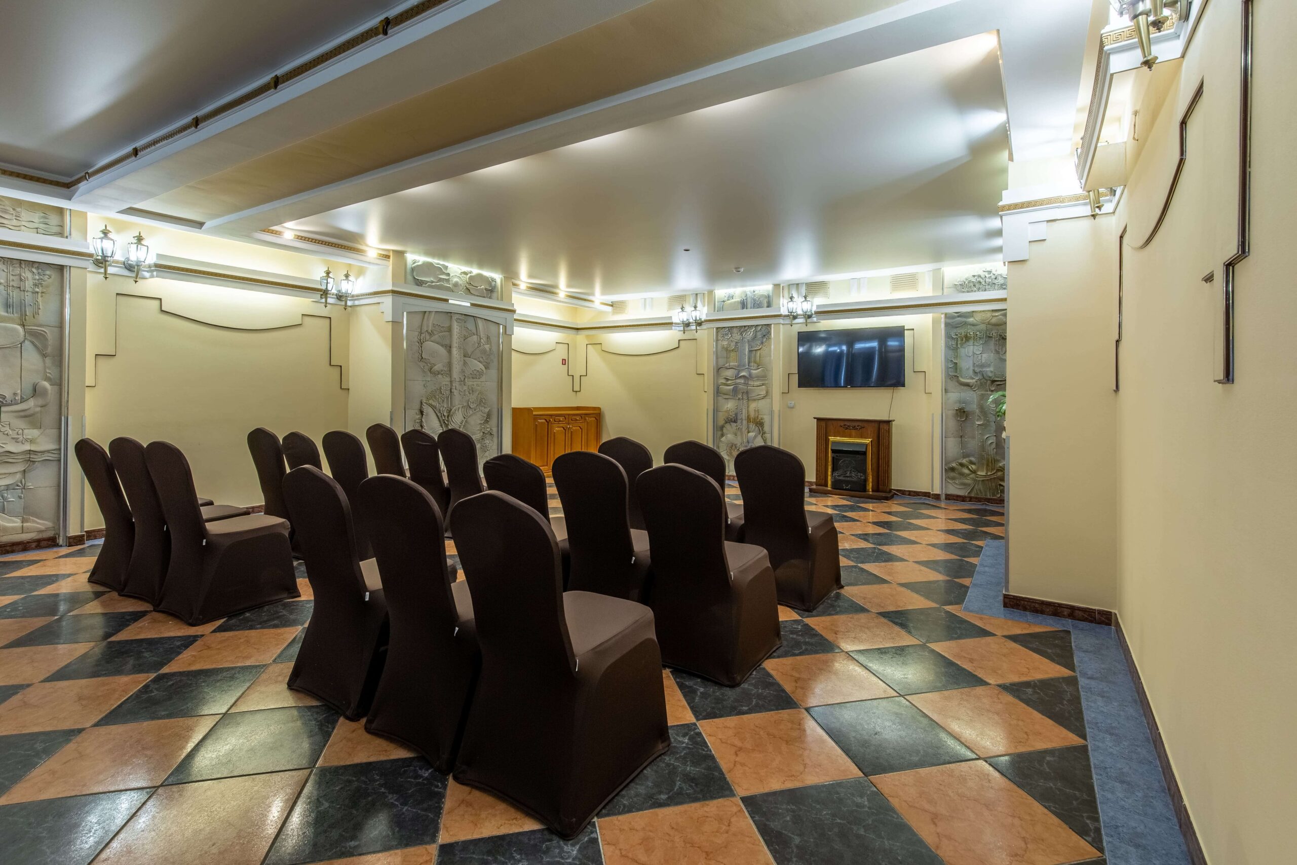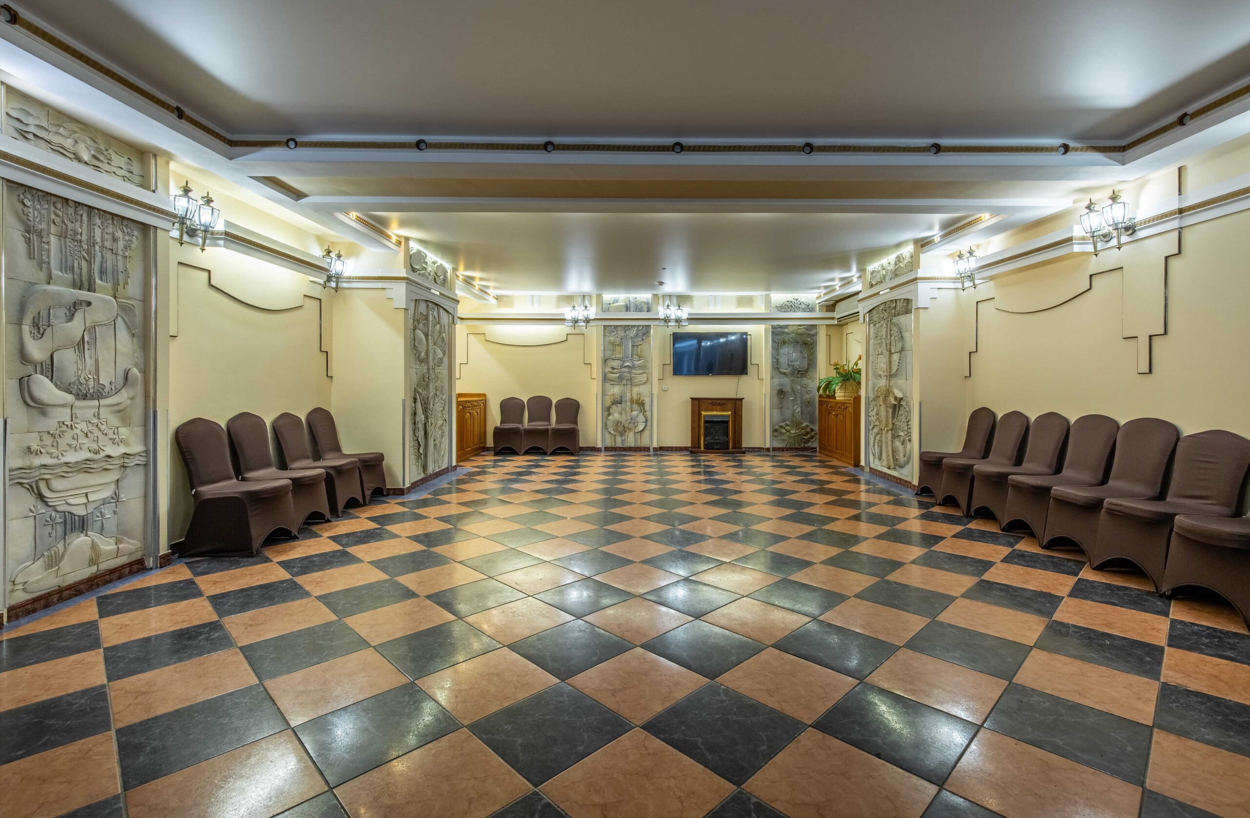 Выполненный в традиционном европейском стиле, этот зал имеет свою особенность, выделяющую его и придающую помещению особый статус. Речь идет об аккуратных изысканных барельефах в приятных бежевых тонах, украшающих стены по периметру помещения. А золотистая отделка, будто бы опоясывающая зал под потолком, делает помещение еще более элегантным и утонченным.