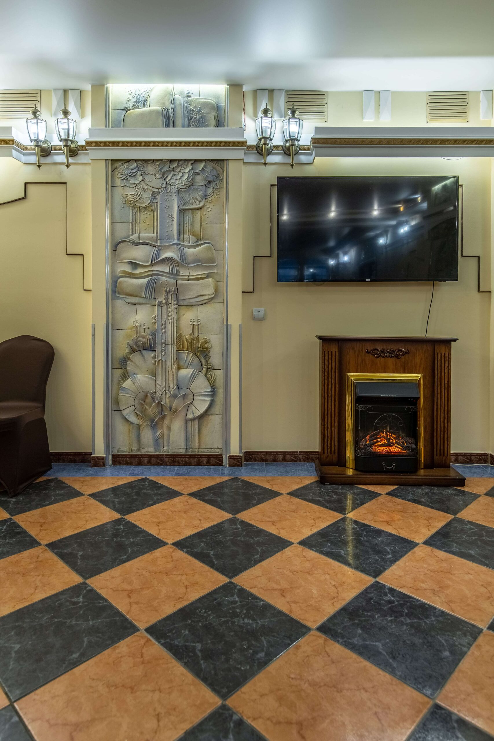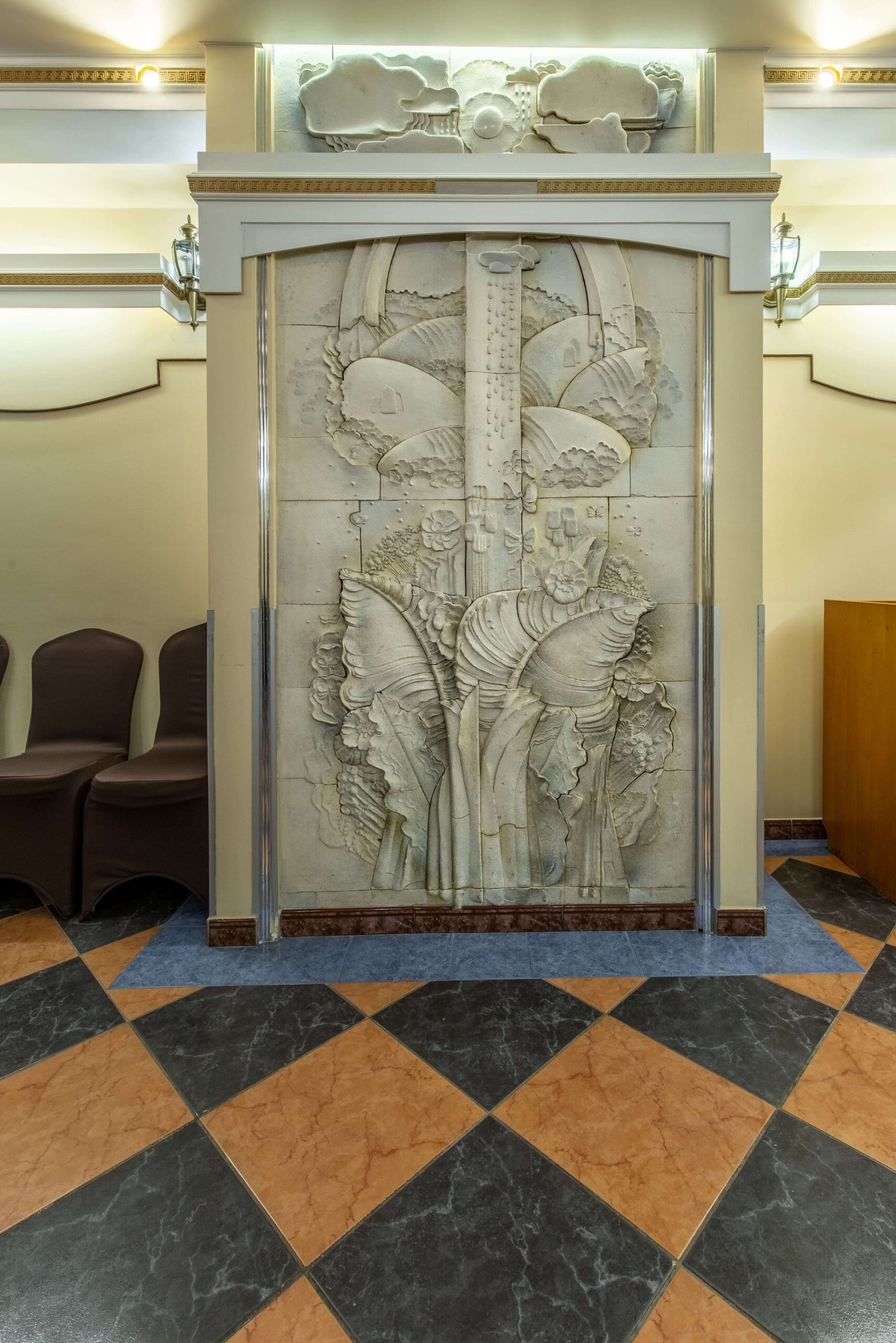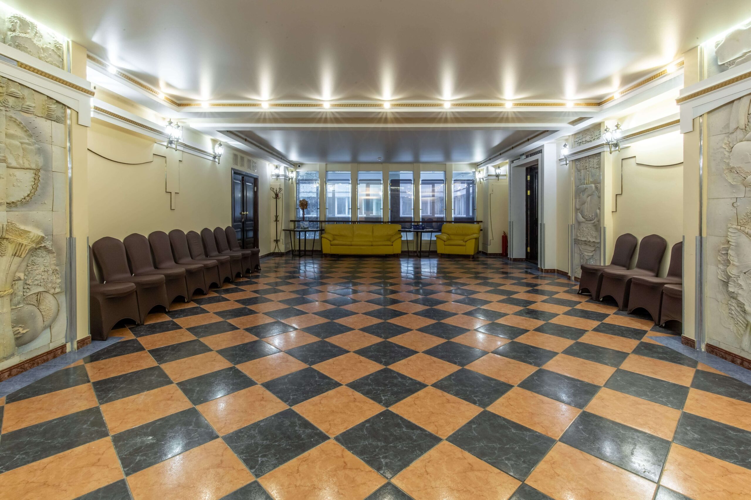 Выполненный в традиционном европейском стиле, этот зал имеет свою особенность, выделяющую его и придающую помещению особый статус. Речь идет об аккуратных изысканных барельефах в приятных бежевых тонах, украшающих стены по периметру помещения. А золотистая отделка, будто бы опоясывающая зал под потолком, делает помещение еще более элегантным и утонченным.