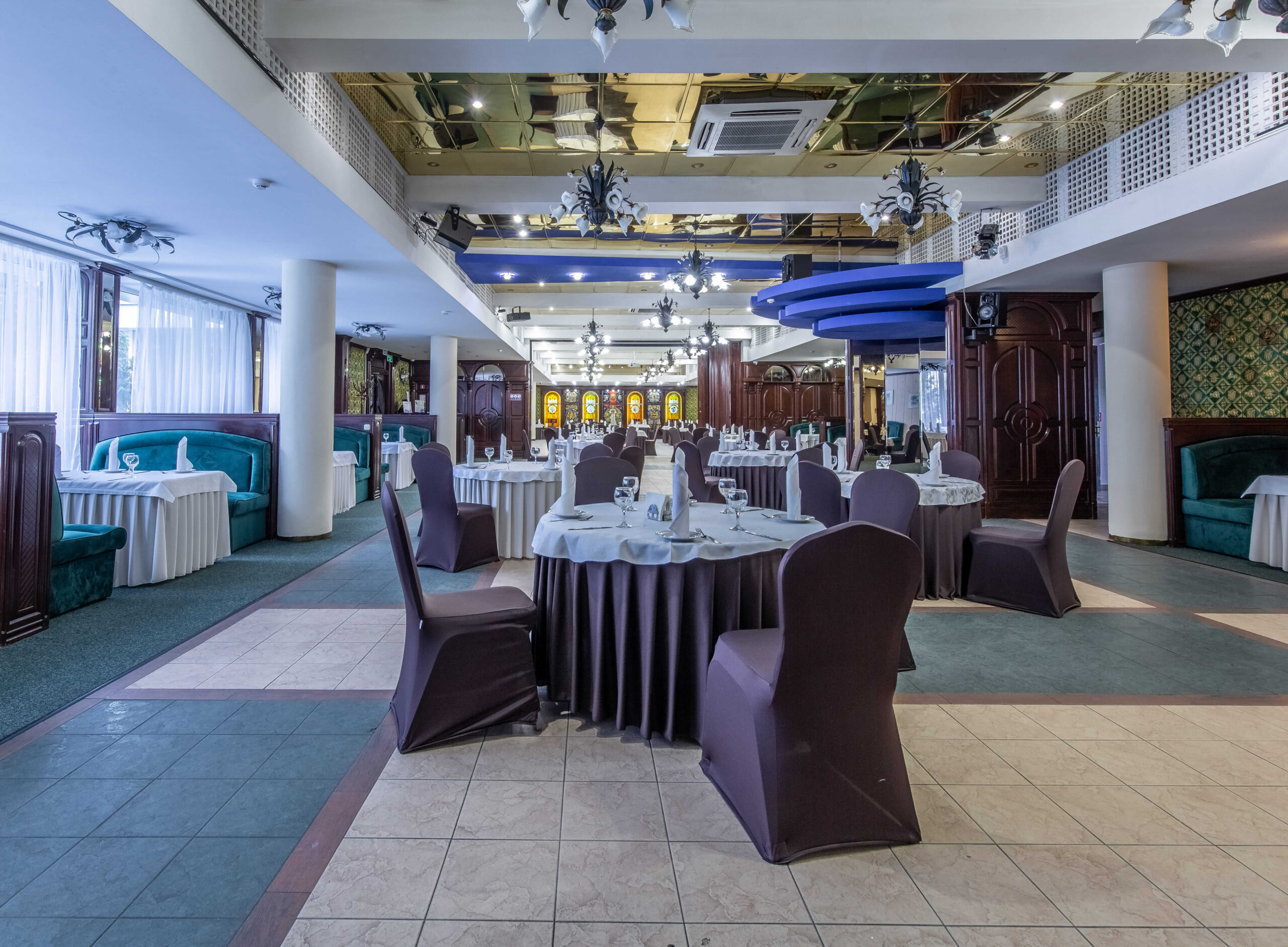 Просторное помещение способно вместить до 70 гостей. Вдоль окон и стен протянулись уютные отдельно стоящие столики, благодаря которым возможна рассадка гостей не за одним большим столом, а небольшими группами. В то же время центр зала достаточно велик, чтобы установить общий банкетный или фуршетный стол, если вы являетесь поклонником такой организации праздничного застолья.